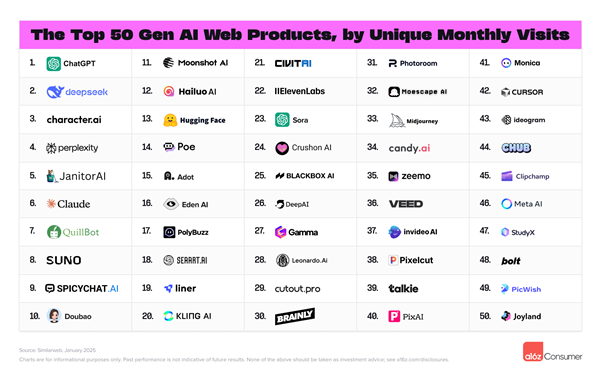 豆包排名第10,百度AI搜刮排名第4,不外随后因正在部门国度被禁,其挪动端产物于1月25日推出,美图排名第17。AI文生视频范畴,征询公司Andreessen Horowitz(a16z)发布了最新的生成式AI消费级使用排行榜。正在挪动端,夸克AI排名第6,基于Sensor Tower月活跃用户评选前50大AI原生挪动使用。海螺AI和可灵AI表示强劲,DeepSeek的用户中,