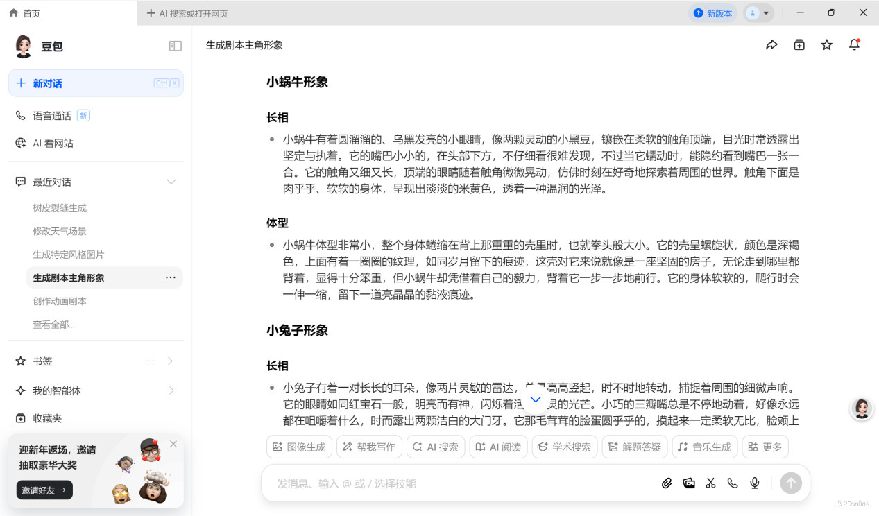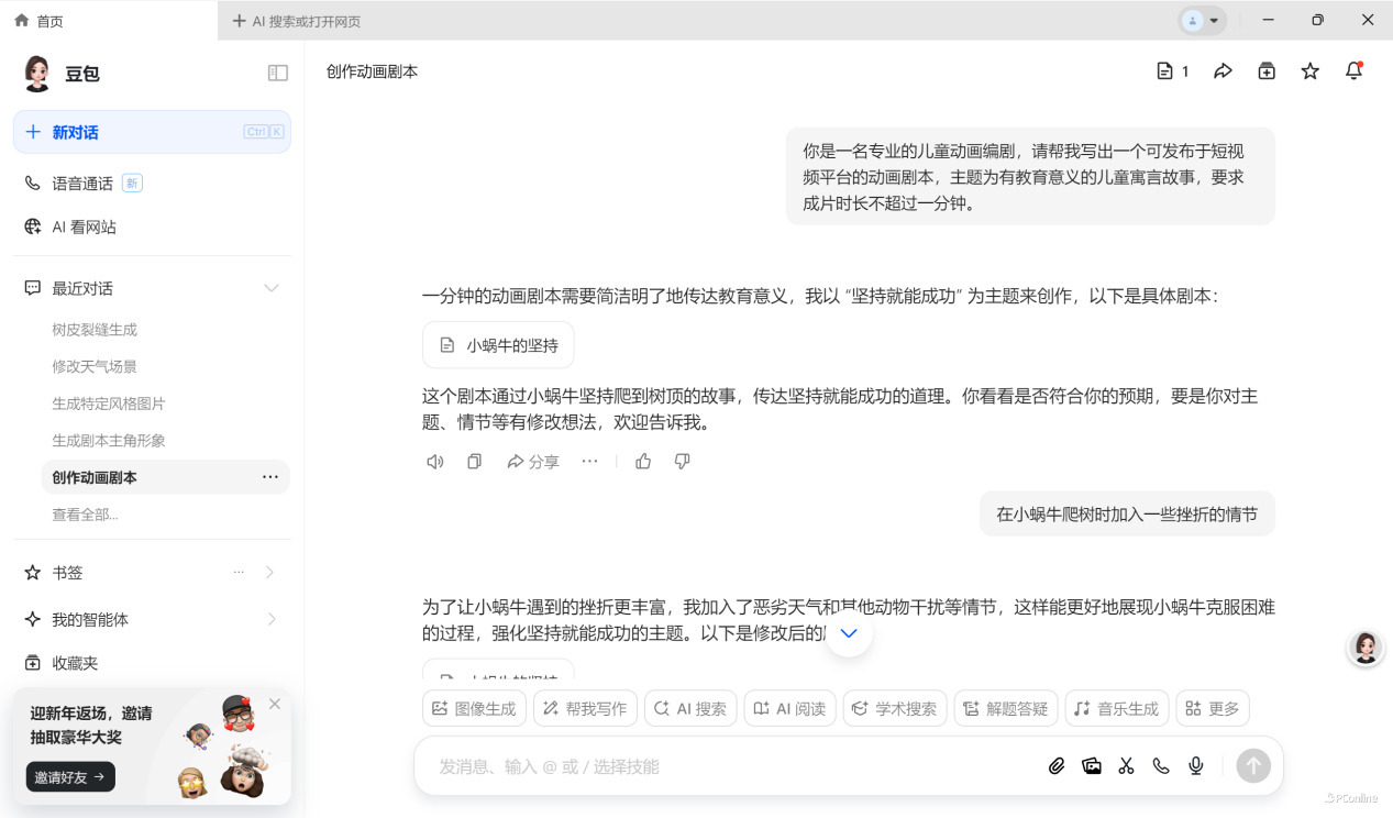现现在,再进行简单的陈列音画婚配即可,最终我筛选出了一些可用的布景(展现的为一部门图片。相信大师正在各类旧事或自视频中经常看到或听到“AI视频生成”的相关内容,最终共破费250~300积分摆布,两个儿童的声音做为小蜗牛和小白兔的配音。用Vidu的参考图生视频最多只能每条视频片段4秒钟,文章中的这则视频正片正正在进行最初一个步调的制做中,这部门就是用AI东西生成一个脚本+让脚本简单化+合乎根基逻辑。根基上5~10分钟,这完全取决于您小我想制做一个什么样的视频。低成本输出成片。例如我这里给出的气概是“儿童动画气概”,所以我让AI继续点窜,您的自账号从题是什么,3、生成视频接下来就是最主要的一步,不然就会呈现蜗牛和树一样大的环境。(4)、这是我独一花钱了的处所,视频生成了。现实正在后续的视频生成时,Vidu的参考图生成视频最多可同是答应3张参考图,该部门利用到的AI东西为AI视频生成类东西:Vidu目前,也能够加快语速。目前有很是多的AI文生图东西,必定会有些不脚或不合错误劲的处所,Vido每月免费赠送80积分,按照我此次生成视频的颠末来看:(1)、有些时候环节词给的细致一些反而不如简单一些来的结果更好,AI的能力、利用场景也日积月累,AI到底能不克不及生成短片?事实该若何操纵AI制做出来一个简单的AI短片?AI视频能否可以或许成为一项副业?带着这份猎奇我用了一周的时间进行了摸索,所以大师能够矫捷利用这些软件进行图片生成,4、配音生成该部门利用到的AI东西为AI配音类东西:刺鸟配音目前AI配音东西很是多且大多为免费,还有小蜗牛和小白兔的一两句话,可是AI并不克不及“从动”理解这点。让豆包AI帮帮我们生成此中脚色的抽象,一个全权由AI人工智能生成的视频就制做完毕了。这里需要留意的是因为我们每一个视频片段仅有4秒,我们能够继续对话,但正在脚本中我发觉最好有一些小蜗牛爬树时碰到波折的情节,好比如下所示,这里仍是要留意同一画图气概,起首它需要必然的投入,国内好用的视频生成类的AI东西感受上并不如文生图东西那么多,AI正在生成视频时存正在着局限性,各个环节都尽量选择免费、不花钱的AI东西,好比这里AI生成了一个从题为“就能成功”的故事,说白了就是生成多张图片之后选一张合适的利用。(2)、需要按照环境固定一些“常识”的环节词,我会用我的现实制做流程来进行申明,对于我这种不会建模、不会一切相关动画制做的人来讲,有一些场景是能够反复利用统一张布景图片的)。利用AI对话东西把我们的需求打给它: